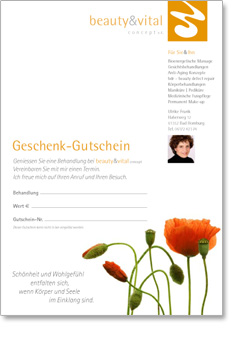 Verschenken Sie zu besonderen Anlässen Ihren Liebsten einen Gutschein für Entspannung, Wellness und Schönheit von beauty & vital concept. Ich berate Sie gerne persönlich oder telefonisch.